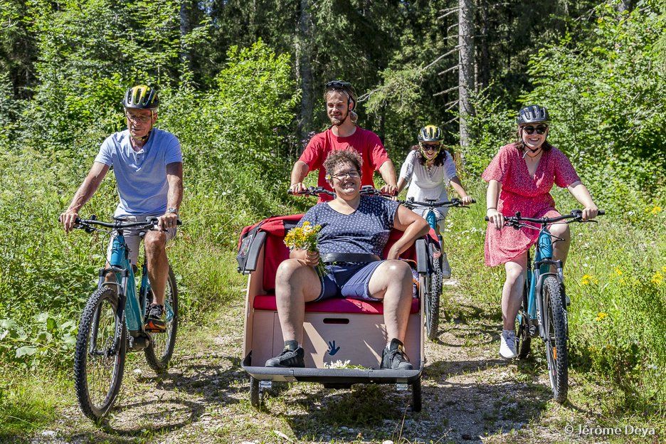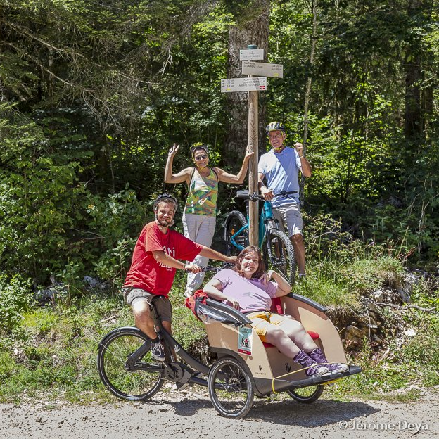 We have joined the “Jurassic Vélo Tour” to offer simple routes departing from Saint Laurent en Grandvaux. We tested the “Jurassic Vélo Tour” itineraries and designed our own circuits for people with disabilities and their caregivers.